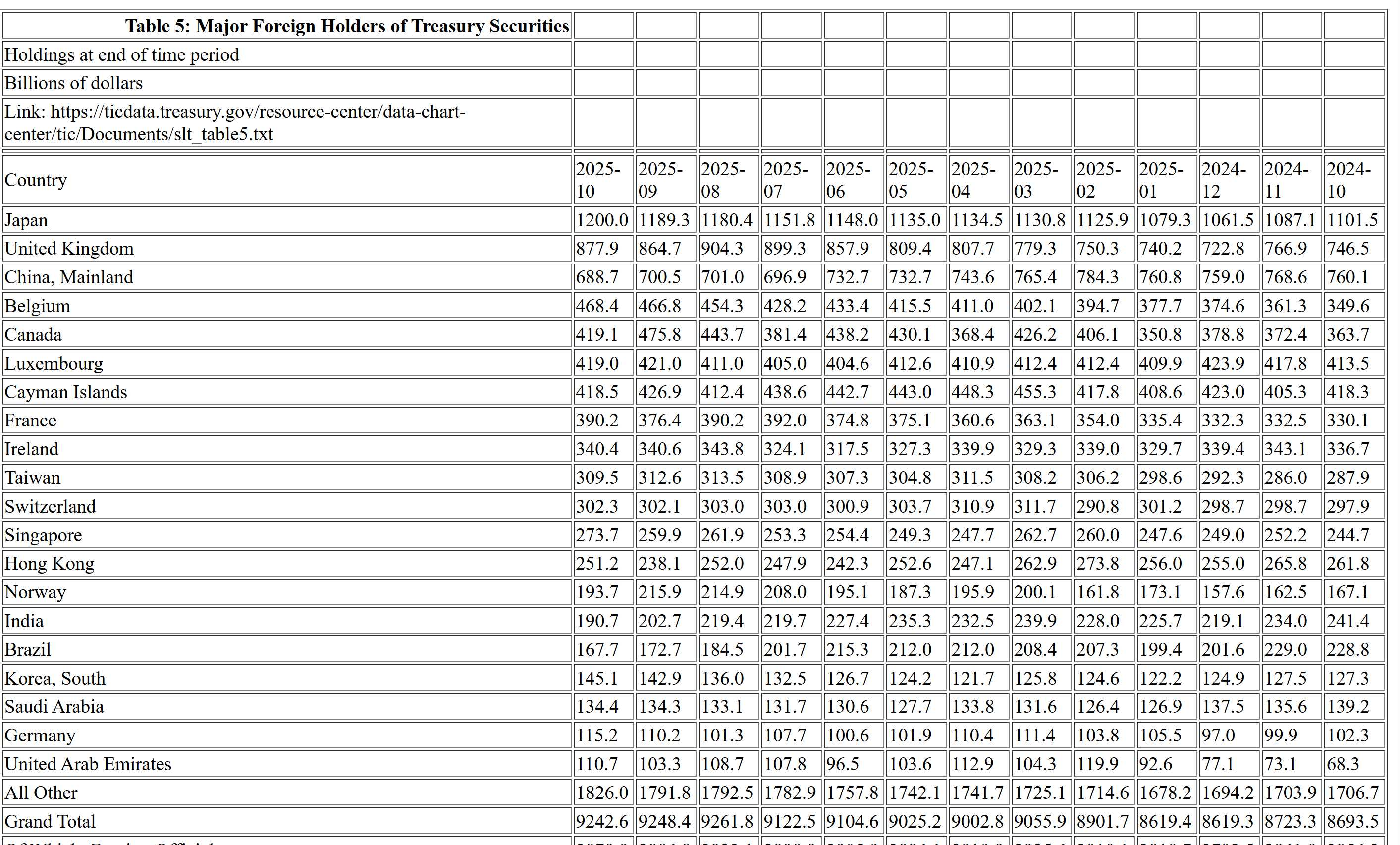 The total scale of U.S. Treasury bonds held by foreign countries decreased by $5.8 billion in October 2025, dropping to $9.24 trillion.