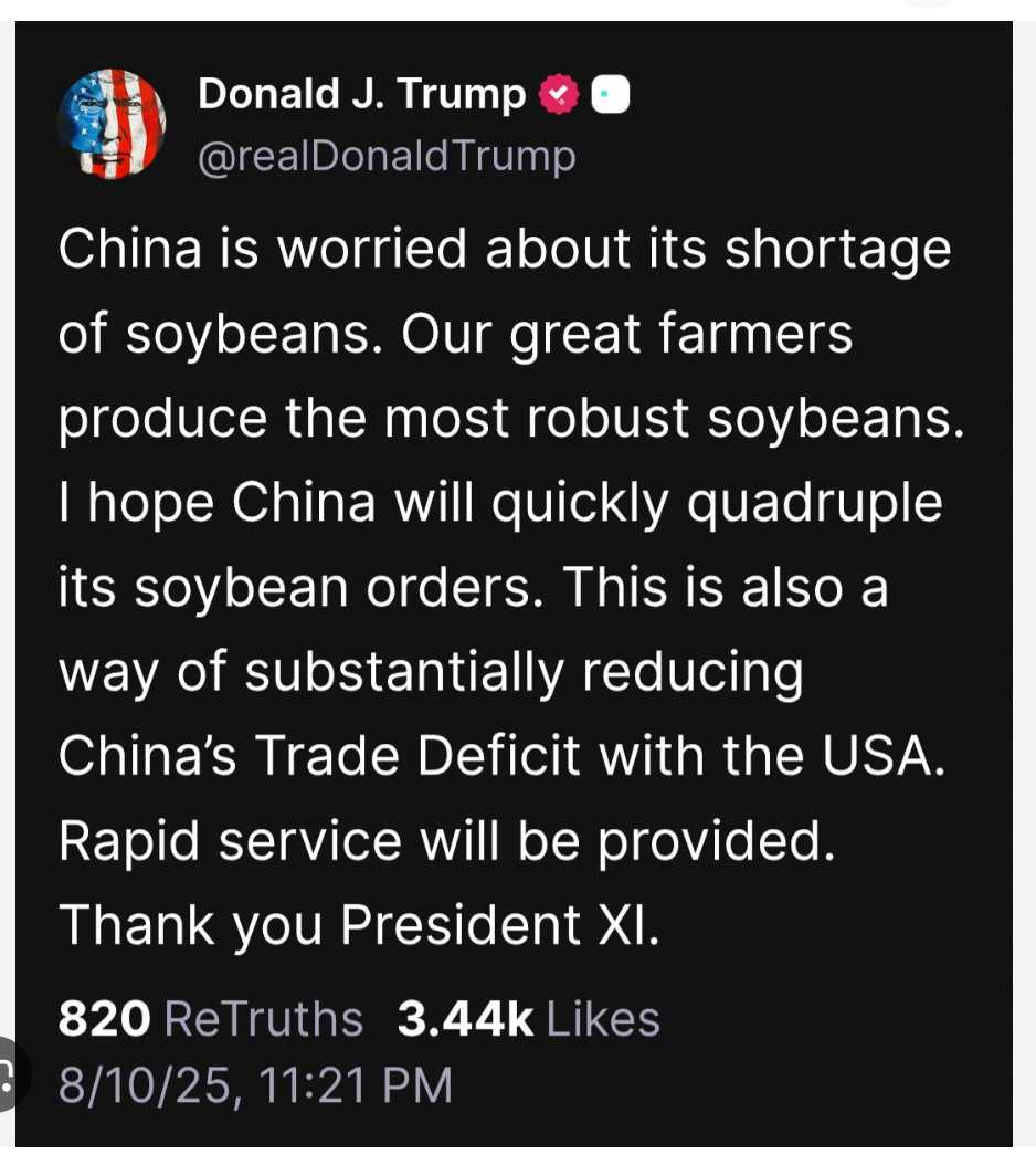 China cares not a duck, not a single soy bean sourced from US in 2025, tons and tons from Brazil and Argentina. Now, trump offers $10 bln bailout to US farmers.**