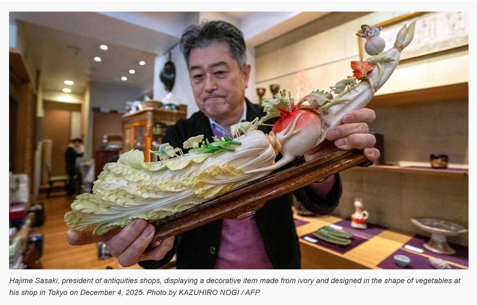 At his store in Tokyo’s ritzy Ginza district, Hajime Sasaki displays a disparate array of wares, from chopsticks to Buddha statues — including many made of ivory.