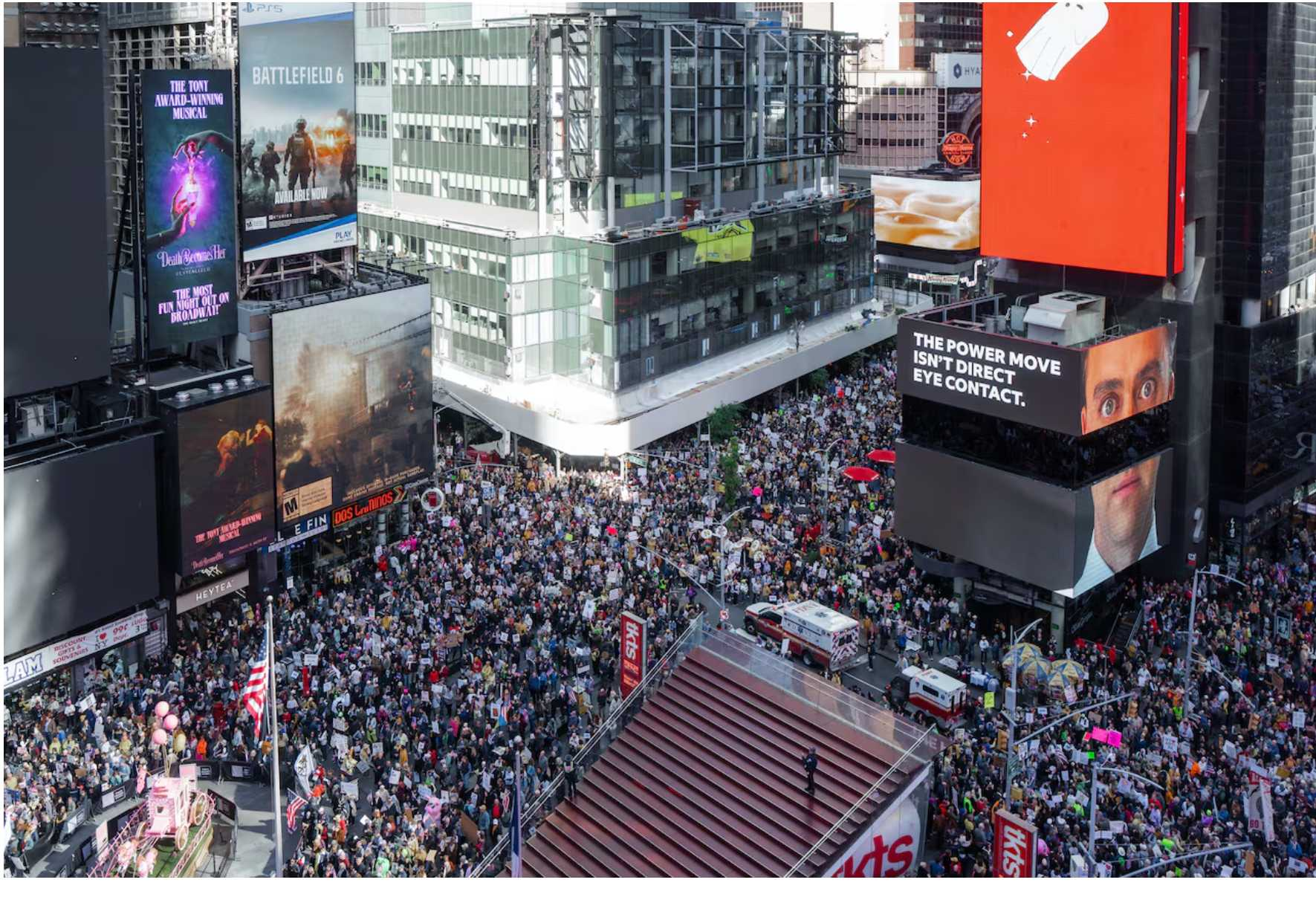 Protest against President Donald Trump has begun in New York City, the first of more than 2,500 rallies organised coast-to-coast across the US on Saturday.